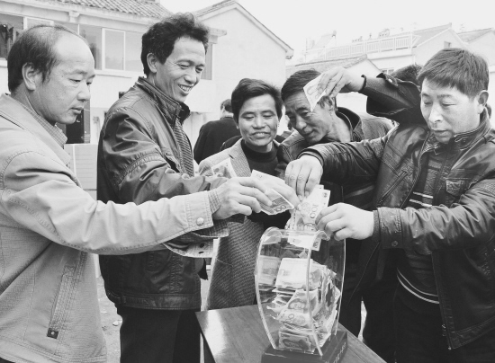 1月20日,浙江省红十字会党组书记、常务副会长王冬梅,绍兴市政协副主席、红十字会会长李露儿,嵊州市委常委、纪委书记闾小锋,嵊州市副市长、红十字会会长夏春燕等领导为嵊州市下王镇清溪村红十字会举行了授牌仪式。图为当地群众为村红十字会踊跃捐款。 (来源:绍兴网—天天商报)