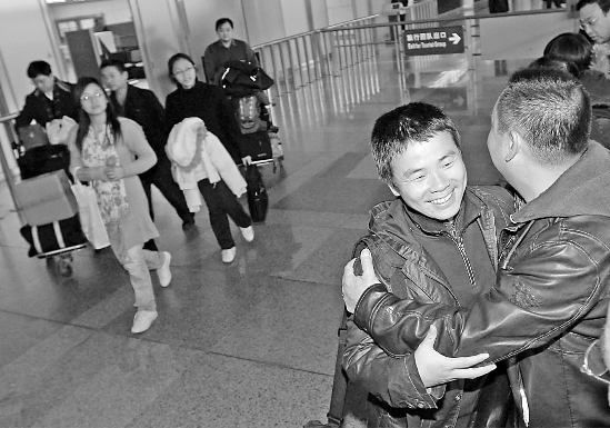 浙江在线01月28日讯 一声“兄弟”,两个七尺男儿隔着半人高的隔离带紧紧抱在一起,红了眼眶。其中一个年长一点的、肚子比较大的男人明明几分钟前还在说,其实没什么啦,像我们这样在外头呆了快十年的人回国倒感觉不习惯了。但是,当“兄弟”现身机场时,这个男人情不自禁地奔跑起来,自然而然地上演了电影中最常见的桥段。回过头来,对着相机闪成一片的媒体,他狠狠地说了句“激动!激动!”