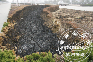 笔者近日发现,普田大道上的绿化带多处被火烧毁。图为天姿公司大门口前的大道绿化带被烧后的惨状。 (绿野)