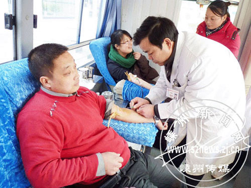 这几天,我市经济开发区不少企业的员工争先恐后地前去献血。雅士林集团有限公司的一位外地员工说,来嵊州工作多年,已对这块土地产生了深厚的感情,回老家过春节前,献上自己的鲜血以表达对嵊州的热爱,是一件很有意义的事。图为献血的场景。