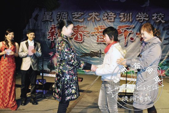 昨日下午,市星源艺术培训学校在市越剧艺术中心举办新春音乐会。音乐会开始前,主办单位奉献了爱心,将音乐会部分门票收入现场捐给本报曾报道过的“绣花女孩”王明敏(右二),赢得了观众阵阵掌声。本网报道北漳镇中学15岁学生王明敏靠绣花边支撑一个破碎的家后,许多爱心读者纷纷进行了捐款捐物,目前直接捐款已达5万多元。