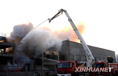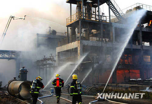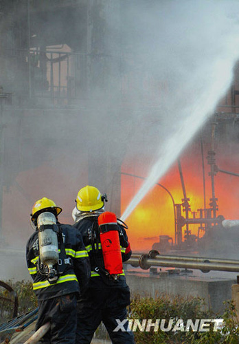 2月20日,浙江绍兴消防人员在火灾现场灭火。当日14时许,位于浙江绍兴袍江新区越秀路的浙江恒业成有机硅有限公司硅油车间原材料储罐突然起火,并伴有爆炸导致硅油车间也发生燃烧。由于当地消防人员及时全力扑救,火势很快得到控制,2位轻微灼伤人员得到及时救治。新华社发(袁云 摄)