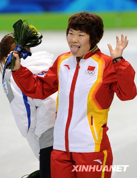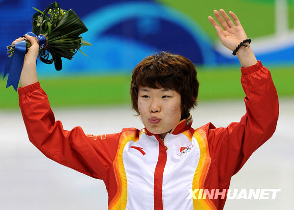 2月20日,在温哥华冬奥会上,中国选手周洋获得短道速滑女子1500米冠军。这是周洋在献花仪式上。新华社记者 陈凯 摄