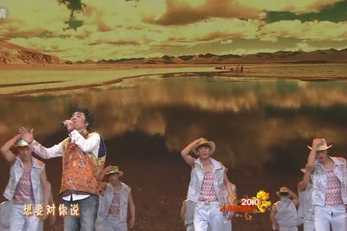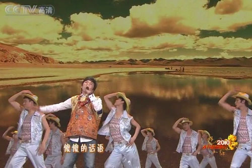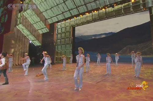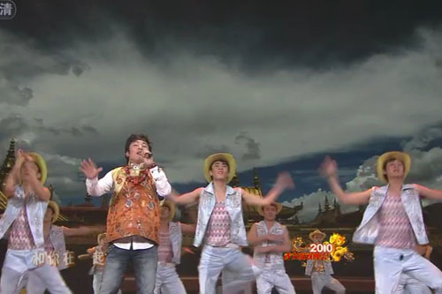 切换到录播带的时候伴舞演员的帽子都整齐的戴在头上。