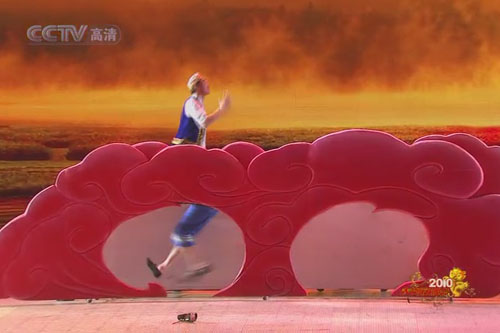 演员身体和腿奔跑的方向相反,舞台中间还有前面一个节目演员脱落的鞋子。