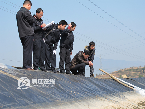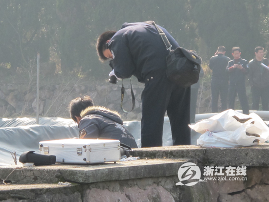 台州市公安局刑侦支队副支队长金先顺正在现场指挥勘查,他蹲在塘边,指着靠近山坡的一处塑料膜说,这里发现了从岸上往水塘里滑落的痕迹,在长约2.4米的范围内,数了一下竟有9道痕迹,其中第三道到第六道痕迹一直延伸到水里。