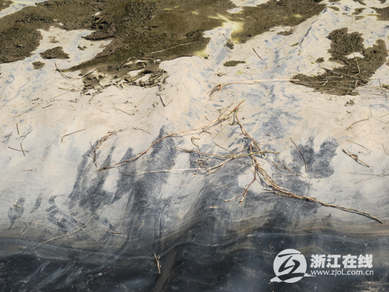 水抽干后,可以明显地发现,其他塘坡上的淤泥和青苔都是完整的,而这块区域的淤泥和青苔有明显用力摩擦过的痕迹。