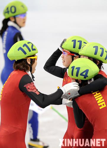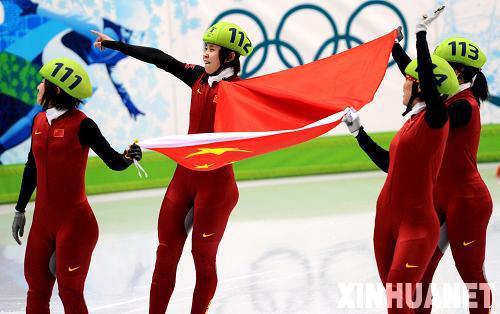 2月24日,中国选手在夺得冠军后庆贺。当日,在温哥华冬奥会短道速滑女子3000米接力赛中,中国队以4分06秒610的成绩勇夺冠军。新华社记者 陈凯 摄