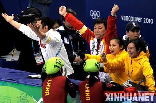 2月24日,中国选手在夺得冠军后庆贺。当日,在温哥华冬奥会短道速滑女子3000米接力赛中,中国队勇夺冠军。 新华社记者 申宏 摄