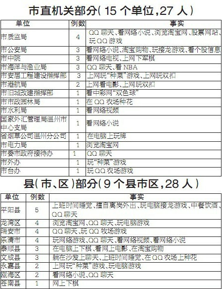 检查人员也发现一些不和谐之音。个别机关人员在上班时间串岗闲聊、上网聊天、炒股、打牌、玩游戏,被检查人员逮了个正着。如平阳县鳌江镇一副镇长中餐饮酒。