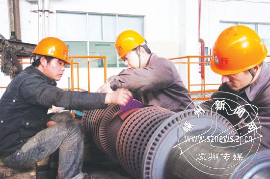 昨日,嵊州新中港热电有限公司员工在检修汽轮机转子。去年,该公司狠抓节能减排,全年供电14235千瓦时,供热84.3万吨,分别比上年度增加67.26%和13%,为缓解我市供电压力发挥了一定的作用。为做好新年度供电供热工作,有关检修人员利用春节期间用电用热淡季,抓紧检修设备,以确保日后的正常生产。