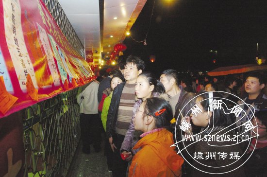 昨天是元宵佳节。随着虎年第一轮满月升上天空,人们纷纷走出家门,赏月、赏灯、猜谜。大街上、广场上,人山人海,花灯如昼。  一些银行、宾馆前挂满了灯谜。猜谜爱好者仰头看谜面、低头细琢磨,猜中的人收到了主办单位送出的奖品。图为猜灯谜现场。