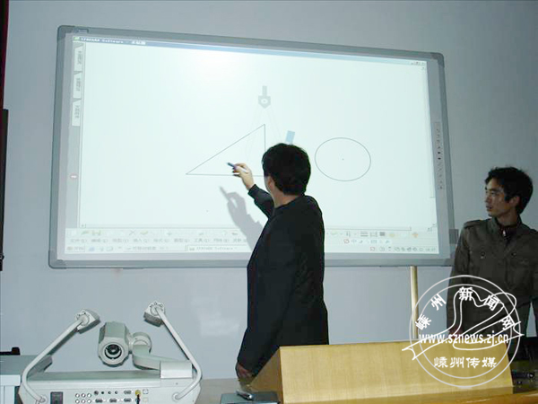 在蛟镇中学八(4)班的教室里,一块白板将教室里的黑板遮住了半边脸,借助多媒体设备,数学老师在白板上随心所欲地画出各种图形——这就是该校率先引进的交互式智能电子白板。电子白板的引进使得课堂教学更加智能化,教学手段更加多元化。