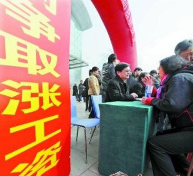 3月2日,河北举行“全省工资集体协商百日行动启动仪式”,现场众多市民前来咨询“如何争取涨工资”的合法信息。