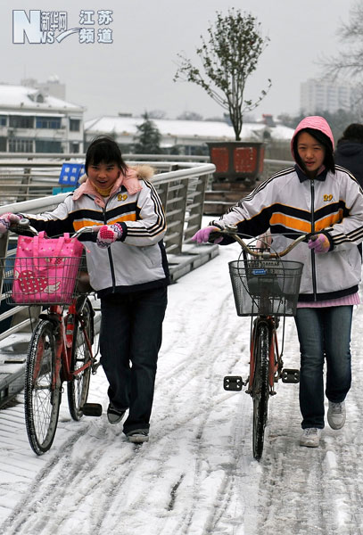两名中学生推车走过积雪冰冻的秦淮河人行桥。