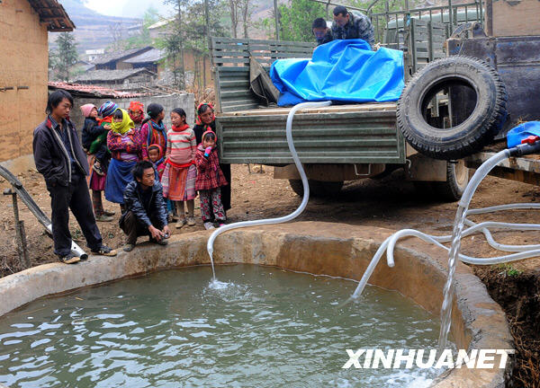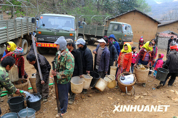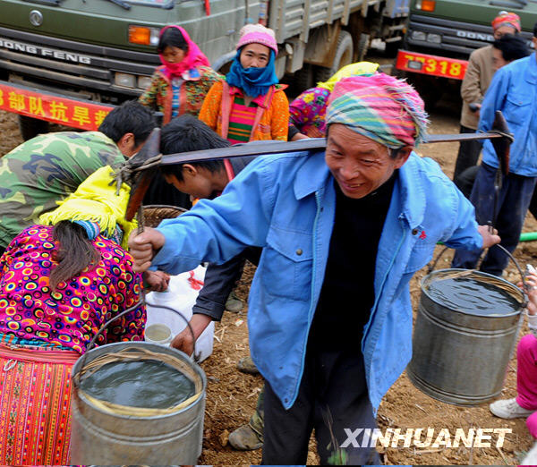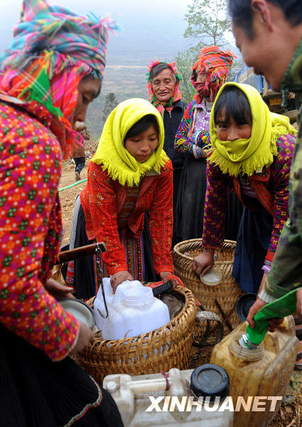 3月8日,位于中越边境的云南省文山壮族苗族自治州富宁县消防部队、当地驻军为该县苗族聚居的木央镇村民送来了25车及时水。目前,在持续干旱影响下,该镇严重缺水,有4万多人及3万多头大牲畜饮水困难。新华社记者 陈海宁 摄