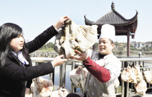昨日,天气晴好,嵊州市里湾山庄农家乐景区里,厨师正在晒腌制好的100余个猪头。上百个腌猪头挂在一起,场面还挺“壮观”的。