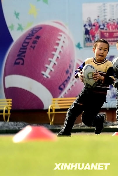 一名橄榄球队的小队员在进行战术训练(3月11日摄)。 新华社记者姚剑锋摄