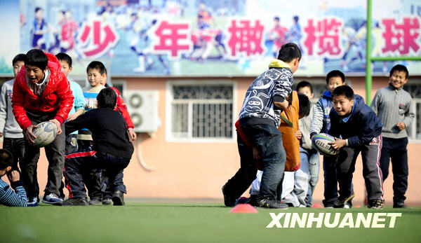 橄榄球队的小队员们在进行战术训练(3月11日摄)。 新华社记者姚剑锋摄