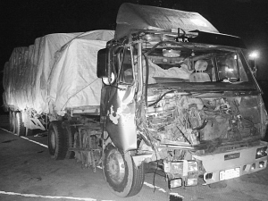 昨天1点多,甬金高速公路交警在嵊州服务区内发现一辆“长相”奇怪的重型半挂货车,走近一看,才发现该车的车头已经完全凹陷,挡风玻璃也没有了。更让交警吃惊的是,车厢内居然还睡着两个人。