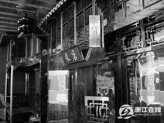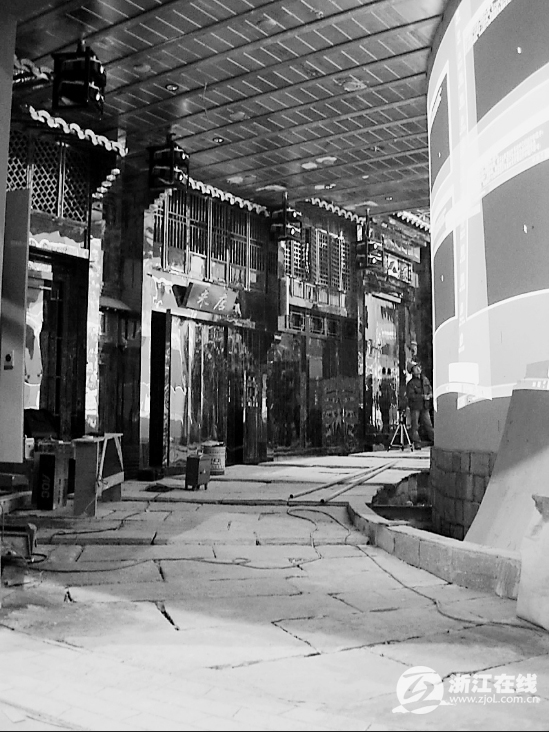 与小镇隔着石板路相望的,是一个高3米、长10米的环行屏幕,以后将循环播一部5分钟的影片《诗画江南》。