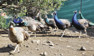 嵊州市虎居山庄里,十多只成年孔雀成为山庄里的特殊风景。据山庄工作人员介绍,这些孔雀都是山庄从小饲养的,目前都已长大。