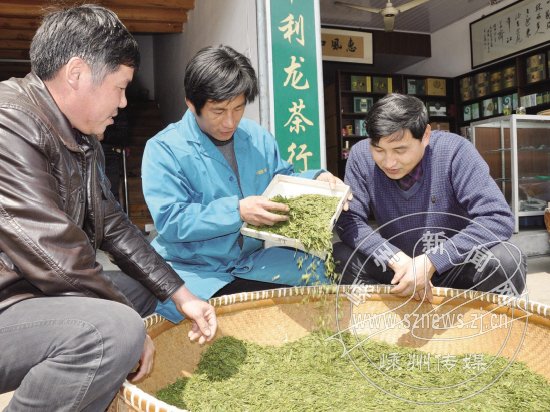 因为前期连续倒春寒,让今年的春茶上市姗姗来迟,而且高档茶收购价比去年提高了30%以上。图为昨日在我市茶叶市场里茶商收购春茶的现场。
