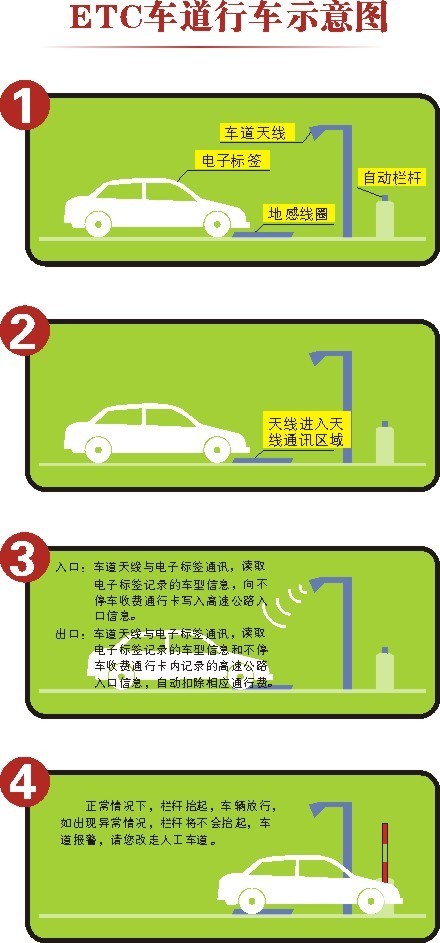 届时,车辆只要以不超过30公路/小时的速度进入收费站ETC(不停车收费系统)车道,装载的电子标签就会与车道感应装置交互信号,“通知”收费站抬起车道栏杆放行,同时收费系统读取、扣款一步到位,过程只需两三秒钟。按照正常的车流量计算,司机通过收费站时完成缴费这一流程需要十二三秒。
