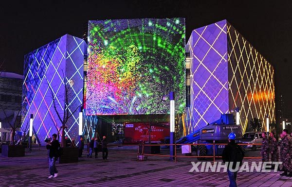 3月31日,上海浦西世博园区国家电网馆点亮景观灯。 当日,上海世博园区流光溢彩,以绚丽的姿态迎接世博会开幕倒计时30天的到来。新华社发(郭长耀 摄)