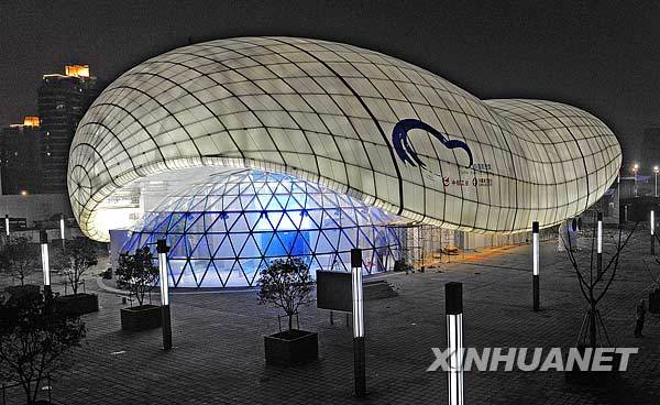 3月31日,上海浦西世博园区中国航空馆点亮景观灯。 当日,上海世博园区流光溢彩,以绚丽的姿态迎接世博会开幕倒计时30天的到来。新华社发(郭长耀 摄)