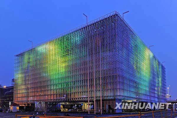 3月31日,上海浦西世博园区上海企业联合馆点亮景观灯。 当日,上海世博园区流光溢彩,以绚丽的姿态迎接世博会开幕倒计时30天的到来。新华社发(郭长耀 摄)