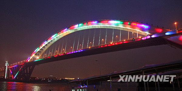 3月31日拍摄的正在进行灯光调试的上海卢浦大桥。当日,上海世博园区流光溢彩,以绚丽的姿态迎接世博会开幕倒计时30天的到来。新华社发(徐正魁 摄)