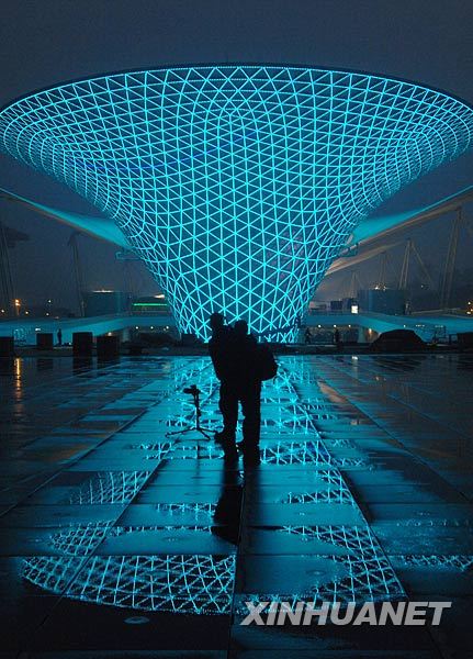 3月31日,两名摄影爱好者在世博轴前拍照。当日,上海世博园区流光溢彩,以绚丽的姿态迎接世博会开幕倒计时30天的到来。新华社发(赵军 摄)
