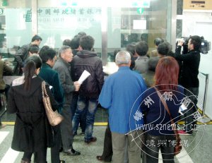 昨日是办理城乡居民社会养老保险手续的第一天,记者在市邮政储蓄银行剡城路营业部的两个缴费专柜前看到,前来办理参保缴费的市民络绎不绝,柜台前排起了长队(如图)。随着养老保险新政的逐渐深入人心,广大城乡居民的参保积极性日益高涨,据统计,截至昨日下午2点,前来办理参保的市民达890人。