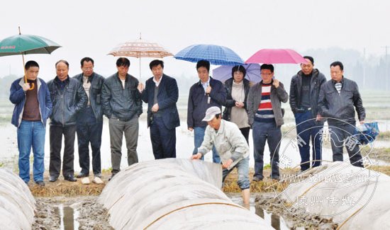 近年来,我市大面积推广无盘简易规格化育秧技术,农民每亩可节省50元投资成本,引起了全省各地种粮大户的关注,在水稻育秧时节,经常有各地农技人员和种粮大户自发组团前来学习经验。图为昨日,来自丽水的农技人员和种粮大户们冒雨在长乐镇邢小华粮食生产合作社的无盘育秧基地学习。