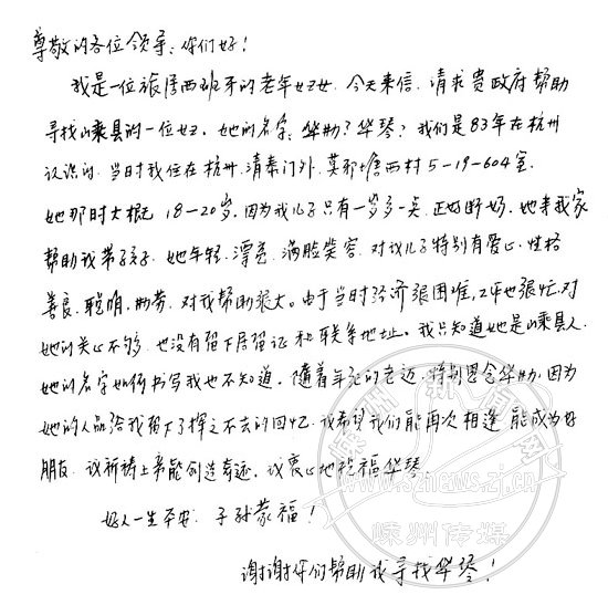这位西班牙华人在信中(附这封信的原件)特别点到,由于时间太久,再加上当时没留下地址与姓名,因此,她写了当时嵊县这个美丽小姑娘的名字也可能叫华勤。记者为求得方便,在上几次的文中只写了可能叫“华琴(谐音)”,为扩大线索范围,我们希望凡在上世纪80年代曾去过杭州领过小孩叫华勤的妇女,见报道后与记者联系。