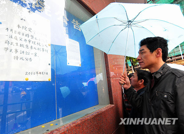 4月8日,南平市民在法院门口观看开庭公告。当日,福建南平“3·23”恶性杀人案在南平市中级人民法院开庭审判。