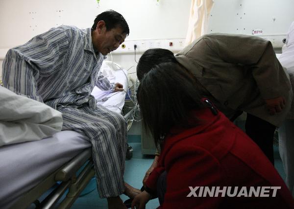 4月9日,在太原山西医科大学附属第二医院,王家岭矿难获救矿工魏合荣(左)见到女儿和岳母后兴奋地要下地走走,女儿和岳母帮他穿鞋。新华社记者 任正来 摄