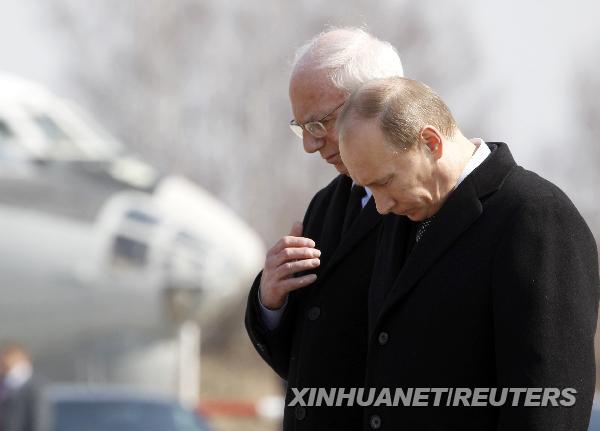 4月11日,在俄罗斯西部斯摩棱斯克市的机场,俄罗斯总理普京(右)在运送波兰总统卡钦斯基遗体回国的仪式上默哀。据波兰媒体当日报道,波兰总统卡钦斯基的遗体将于格林尼治时间12时运抵波兰。新华社/路透