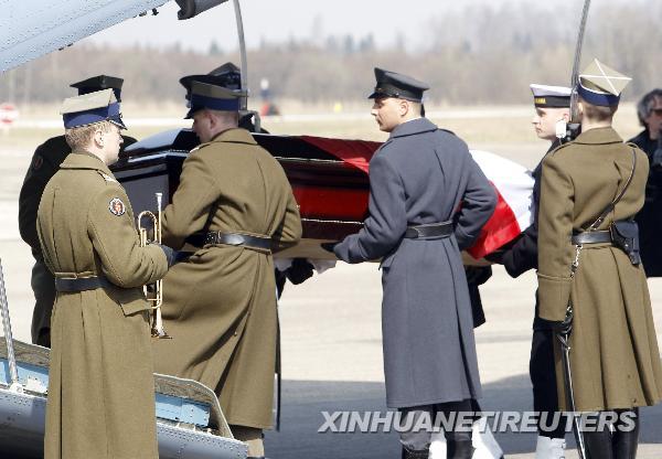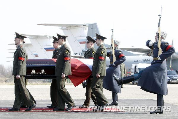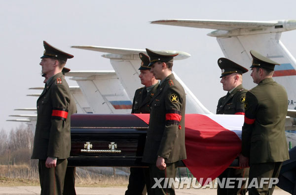 4月11日,在俄罗斯西部斯摩棱斯克市的机场,礼兵护送波兰总统卡钦斯基的遗体回国。据波兰媒体当日报道,波兰总统卡钦斯基的遗体将于格林尼治时间12时运抵波兰。新华社/路透