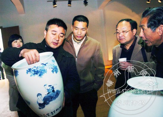 昨日,中国瓷器名人名作藏品展在市艺术村开展,60多件名人名作瓷器吸引了不少收藏爱好者前来参观。市委常委、宣传部长何国英观看展览。据悉展览将于4月18日结束。图为我市收藏爱好者在欣赏瓷器精品。