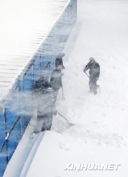 4月13日,清雪工人在风雪中清扫路面。从12日中午开始,哈尔滨突降大雪。黑龙江省12日发布的暴雪蓝色预警和道路结冰黄色预警称,哈尔滨、佳木斯等地局部有大到暴雪。目前风雪仍在持续。新华社记者王春雨摄