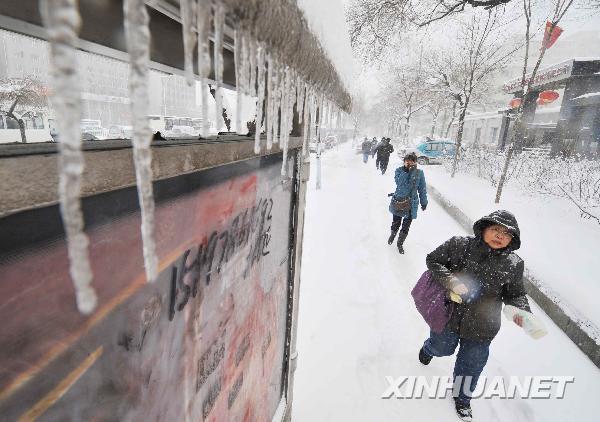 4月13日,市民从公交站台前经过。从12日中午开始,哈尔滨突降大雪。黑龙江省12日发布的暴雪蓝色预警和道路结冰黄色预警称,哈尔滨、佳木斯等地局部有大到暴雪。目前风雪仍在持续。新华社记者王建威摄