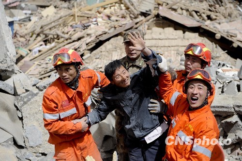 4月15日12时,中国国际地震救援队在青海玉树县结古镇西北牛宾馆废墟上救出了四名幸存者,其间经历了三次余震。 中新社发 廖攀 摄