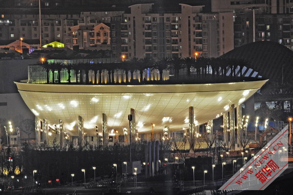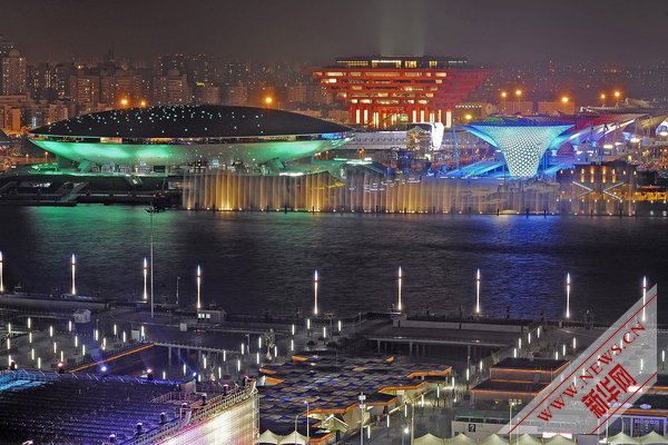 2010年4月17日晚,世博永久场馆进行灯光音乐水幕调试。为迎接4月20日举行的世博会首场试运营。上海世博会进入试运营冲刺阶段,入夜园区各场馆纷纷试灯,世博园的夜色更亮更美了。