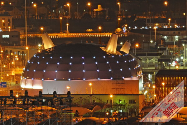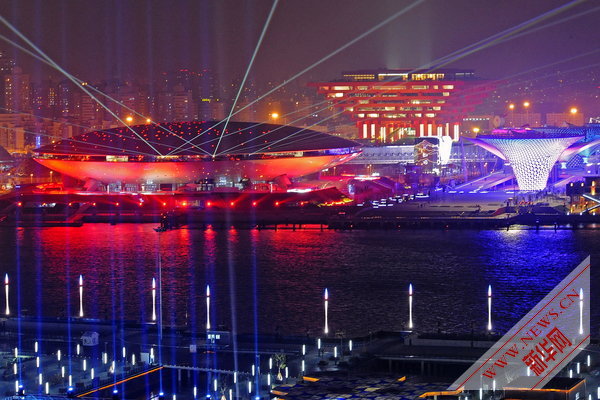 2010年4月17日晚,世博永久场馆进行灯光音乐水幕调试。