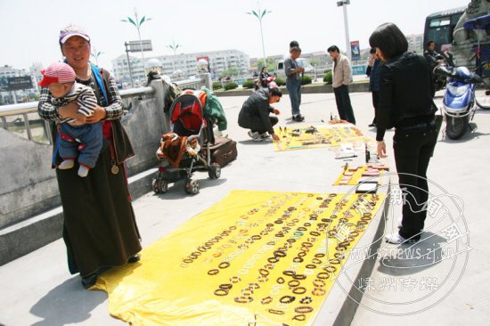 昨日,市区东桥桥头人行道上,两位身穿少数民族服装的外地人,在东桥人行道上设地摊卖装饰品,影响交通安全,希有关部门管一管。