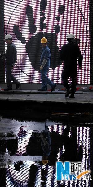 4月19日,几名工人从法国馆外的电子显示屏前经过。