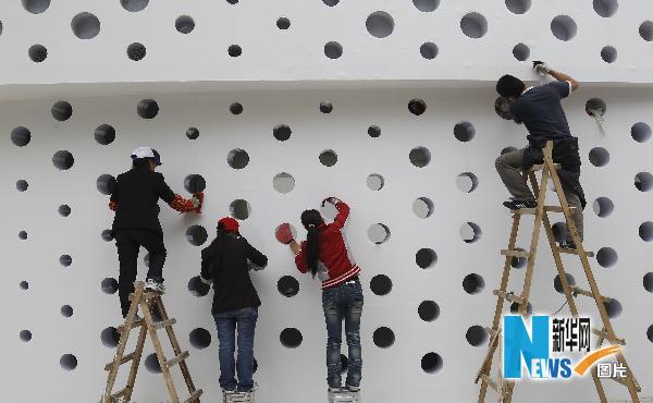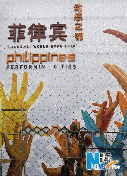 4月19日,工人正在菲律宾馆的外墙上安装装饰贴片。新华社记者 裴鑫摄