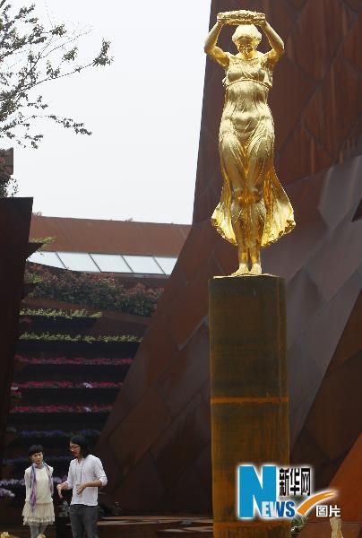 4月19日,两名工作人员正在卢森堡馆内展示的该国国宝——“金色少女像”下驻足。新华社记者 裴鑫摄